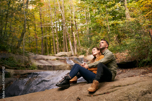 Couple hugging sitting by the river in the forest.