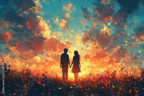 Couple in a Grassy Field Romantic Wedding Photo with Blue Sky and Fluffy Clouds