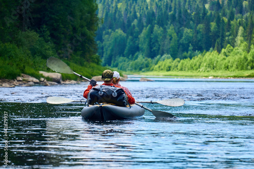 couple in a two-seater kayak rafting down the river among the mountains