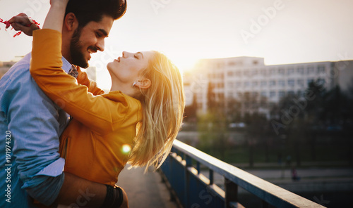 Couple in love cuddling while enjoying beautiful urban sunset together