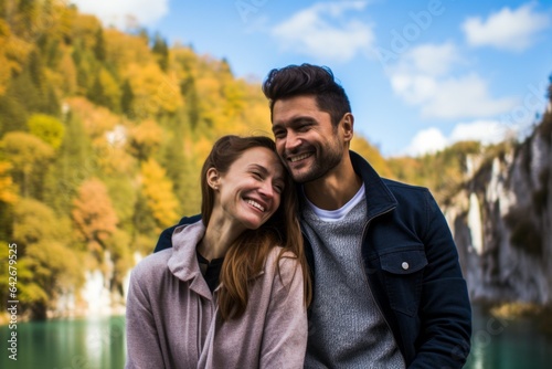 Couple in their 30s smiling at the Plitvice Lakes National Park Croatia