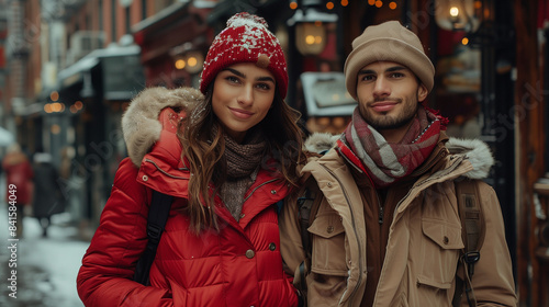 Couple in winter on the street of European city. Fashion shot. Holidays, smiling, shopping, autumn, hat, model, jacket