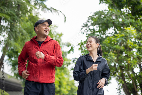 Couple jogging and running outdoors in nature. Happy Man woman wearing sportswear jogging in the Nature. Male and female in running uniform at outdoor. Workout exercise. Healthy and lifestyle.