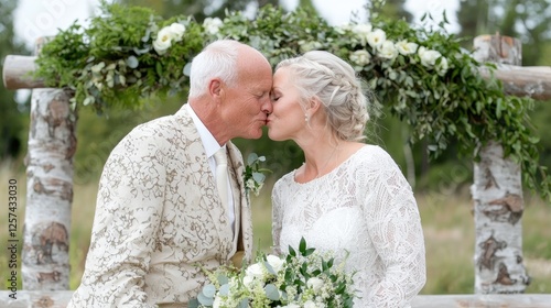 Couple kissing at outdoor wedding ceremony