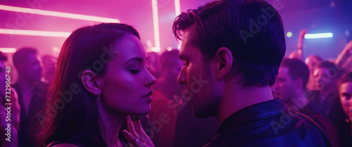 couple kissing in a rave nightclub full of people dancing, close-up, sparks, neon light