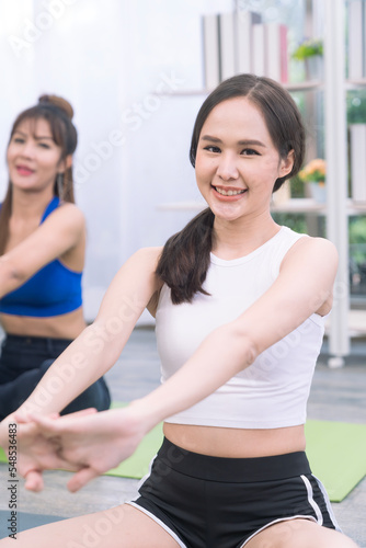 Couple love and romance on holiday. Lesbian women exercising stretching at the living room. woman yoga. Sport woman.