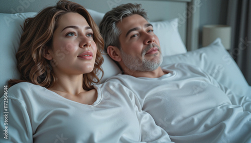 Couple lying in bed, relaxed and contemplative, with soft lighting