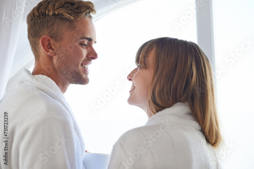 Couple, morning and happy in robe together with love, smile and eye contact in home or honeymoon. Man, woman and partnership with trust by window in house, connect and romance relationship with care