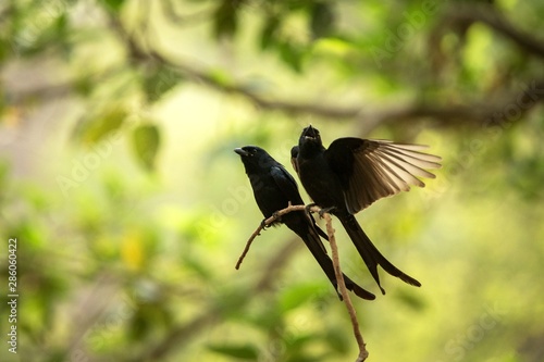 Couple of black drongos (Dicrurus macrocercus) sitting on branch and screaming or singing, native to the Indian Subcontinent, wildlife bird photography, clear background, Ranthambore, India