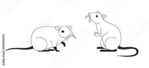 Couple of cute domesticated rats black and white 2D line characters. Adorable small animals asking for food. Funny rodent pets isolated vector outline personages. Monochromatic spot illustration