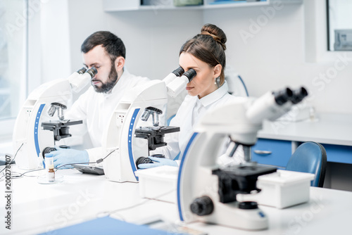 Couple of medics in uniform working with microscope making analysis at the laboratory office