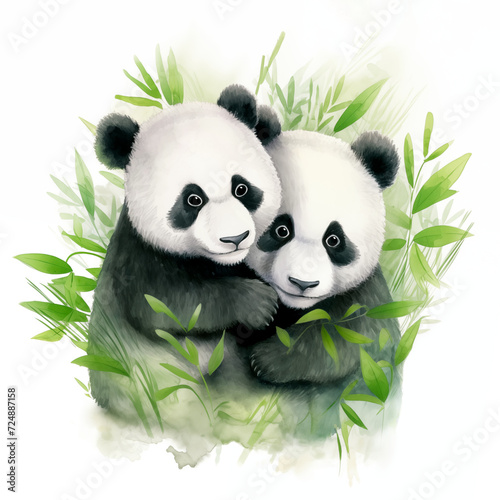 Couple of panda bears with bamboo leaves contour on background. Cute little animals hug each other with love. Watercolor style, AI generated. Card with lovely illustration.