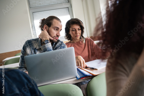 Couple of students working together on some task. They're sitting in a classroom and learning together.