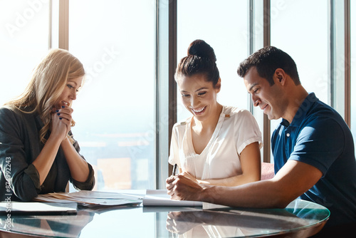 Couple, paperwork and signature with investment advisor for financial planning, compliance and agreement. Office, married people and consultant with document for budgeting, saving and future goals