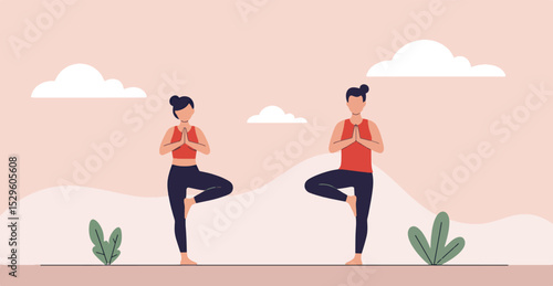 Couple Practicing Tree Pose Yoga Outdoors Find Inner Peace and Balance