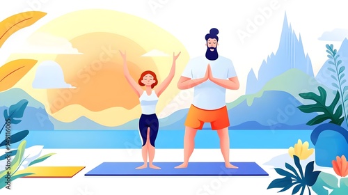 Couple Practicing Yoga Outdoors in Nature - Meditation Illustration