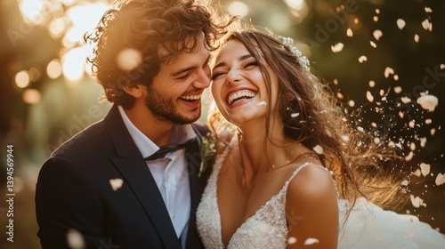 Couple radiates happiness as they embrace, surrounded by floating flower petals and warm sunlight during an enchanting outdoor wedding celebration that captures pure joy and romance
