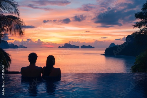 Couple relaxing in infinity pool enjoying El Nido sunset in Palawan, Philippines