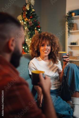 Couple relaxing on sofa drinking coffee by christmas tree
