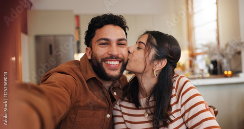Couple, selfie and happy in home embrace, photography and capture memory in relationship. Partner, romance and social media update on commitment, bonding and post moment of affection in marriage