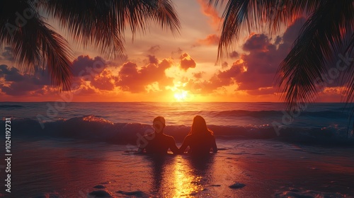 Couple silhouetted against a fiery sunset on a tropical beach.
