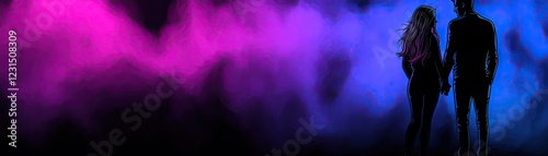 Couple silhouetted against vibrant smoky backdrop, romantic evening, mystery