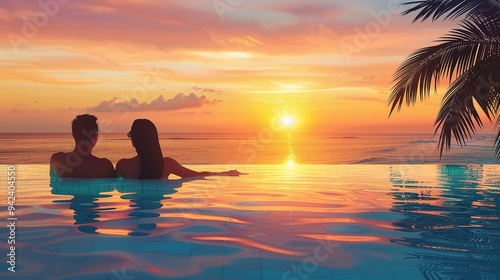 Couple Silhouetted in Pool at Sunset Overlooking Ocean