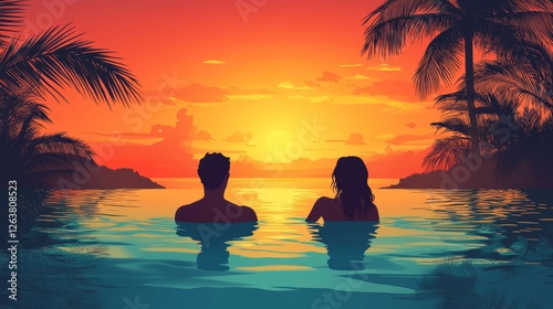 Couple Silhouetted in Tropical Ocean at Sunset.