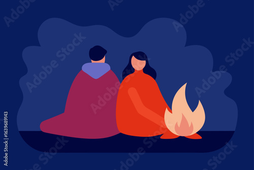 Couple Sitting by Fire Wrapped in Blanket at Dawn