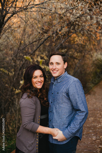 Couple smiling on autumn boardwalk