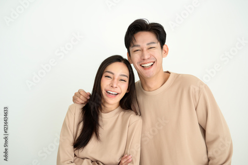 Couple Smiling Together in Matching Outfits, Showcasing a Warm and Friendly Atmosphere at Home