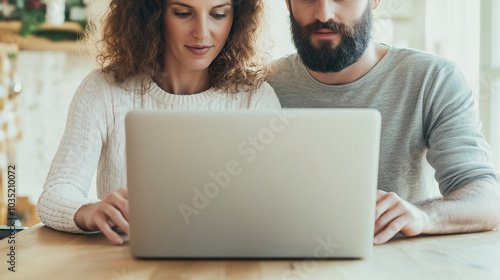 Couple using a laptop to shop online together, seated at a dining table with gift lists, SHOTLISTseason, online shopping, teamwork, planning, devices
