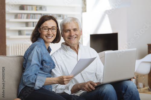 couple using their laptop to pay their bills at home in the living room