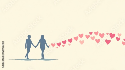 Couple Walking Hand-in-Hand on Heart-Lined Path, Minimalistic Vector Art in Pastel Colors
