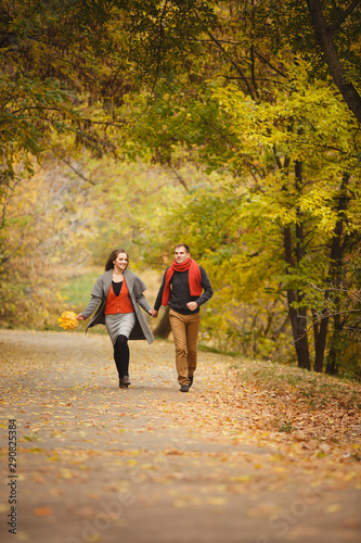 Couple weared in autumn-style clothes (oranfe scarf and vest) running through the autumn landscape. Alley covered with yellow foliage. Autumn walk outdoors. Two lovers in autumn park. Romantic dating