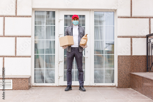 Courier in protective mask and medical gloves delivers takeaway food. Delivery service under quarantine, disease outbreak, coronavirus covid-19 pandemic conditions.