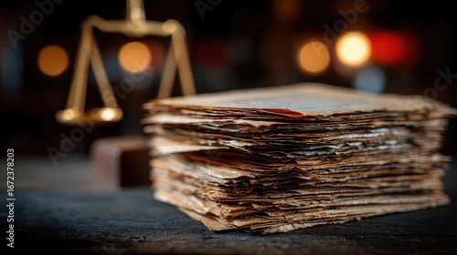 Court transcripts piled with justice watermark over cover symbolizes documentation, fairness, legal record, truth, structure, ethics, accountability, compliance, authority, governance
