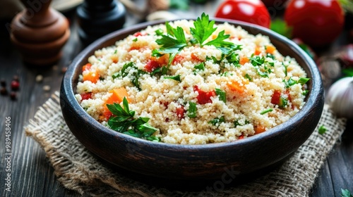 Couscous with mixed vegetables and herbs set against a dark rustic wooden backdrop