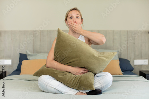 covering mouth with a hand and shocked or surprised expression. pajamas or night wear concept