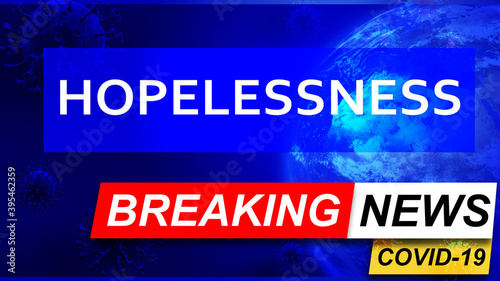 Covid and hopelessness in breaking news - stylized tv blue news screen with news related to corona pandemic and hopelessness, 3d illustration