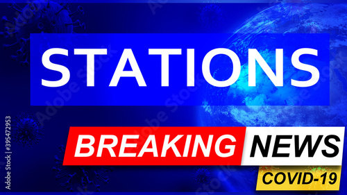Covid and stations in breaking news - stylized tv blue news screen with news related to corona pandemic and stations, 3d illustration