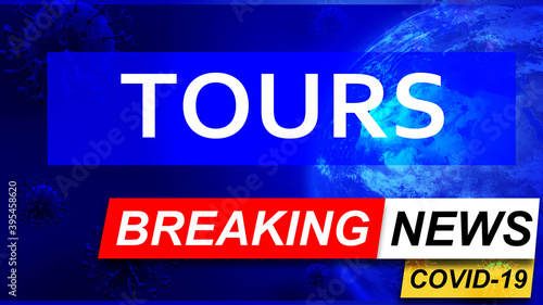 Covid and tours in breaking news - stylized tv blue news screen with news related to corona pandemic and tours, 3d illustration