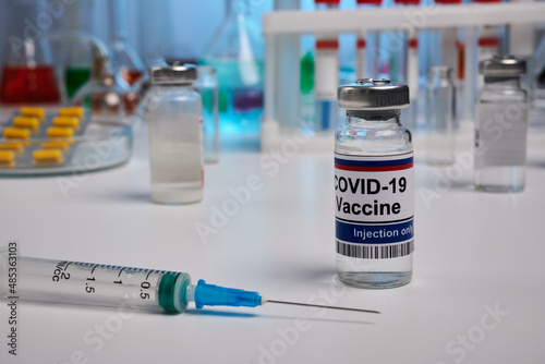 Covid vaccine glass bottle and syringe on a lab desk. Science photo for pharmacy exploration laboratory. Antivirus vaccine for coronavirus therapy. Photo for pharmacy drugstores. Chemical glassware.