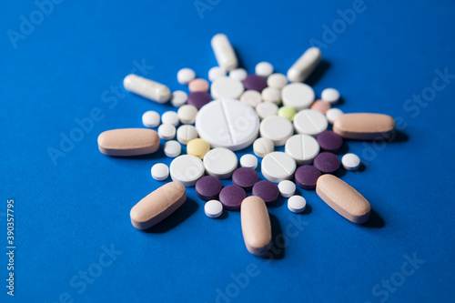 Covid-19 corona virus cure. Colorful medical pills on blue background for ncov-19 diseases treatment.