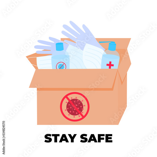 COVID-19. Coronavirus epidemic. Box with virus protection. Hand sanitizer, surgical glove, medical face mask. Stay safe concept.
