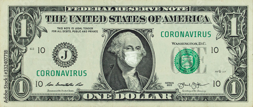 COVID-19 coronavirus in America. One dollar banknote with Franklin in a medical mask. The global financial and economic crisis has affected USA. American money, coronavirus concept. Realistic montage