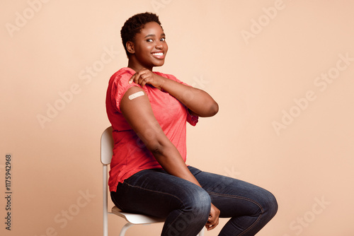 Covid-19 Vaccination Concept. Joyful African Lady Showing Vaccinated Arm With Adhesive Bandage Strip After Coronavirus Antiviral Vaccine Injection Sitting On Beige Background. Studio Shot