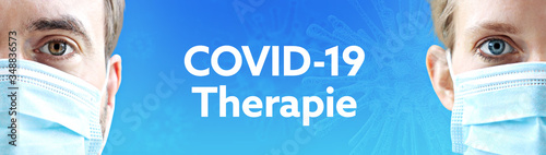 COVID-19-Therapie. Gesichter von Mann und Frau mit Mundschutz. Paar mit Maske vor blauen Hintergrund mit Text. Virus, Atemmaske, Corona