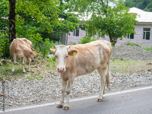 Cow in the village. The cow is walking along the road. Grazing. Village idyll