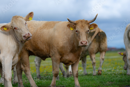 Cow grazing in a green pasture. Cow in the meadow. Livestock grazing in the green field. Farm life with cattle and calves. Cow in a rural landscape. Ranch with grazing bovine. Dairy cow on farm.